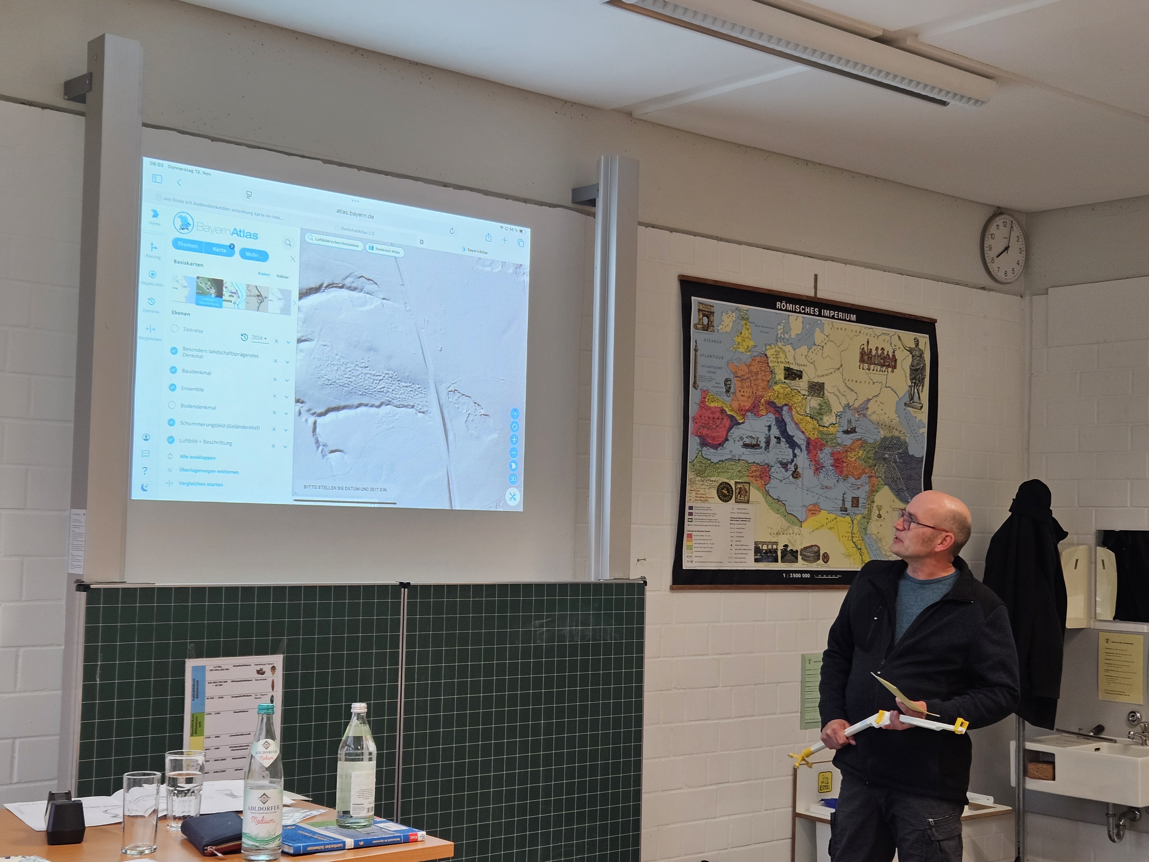 Zu Beginn zeigte Herr Trippensee den Schülern mit Hilfe des Bayerischen Denkmal-Atlas, wo denn bereits Bau und Bodendenkmäler in der näheren Umgebung verzeichnet und beschrieben sind. Mit der Schummerungskarte ist oft schon an der Bodenstruktur die vorliegende Befundsituation erkennbar.