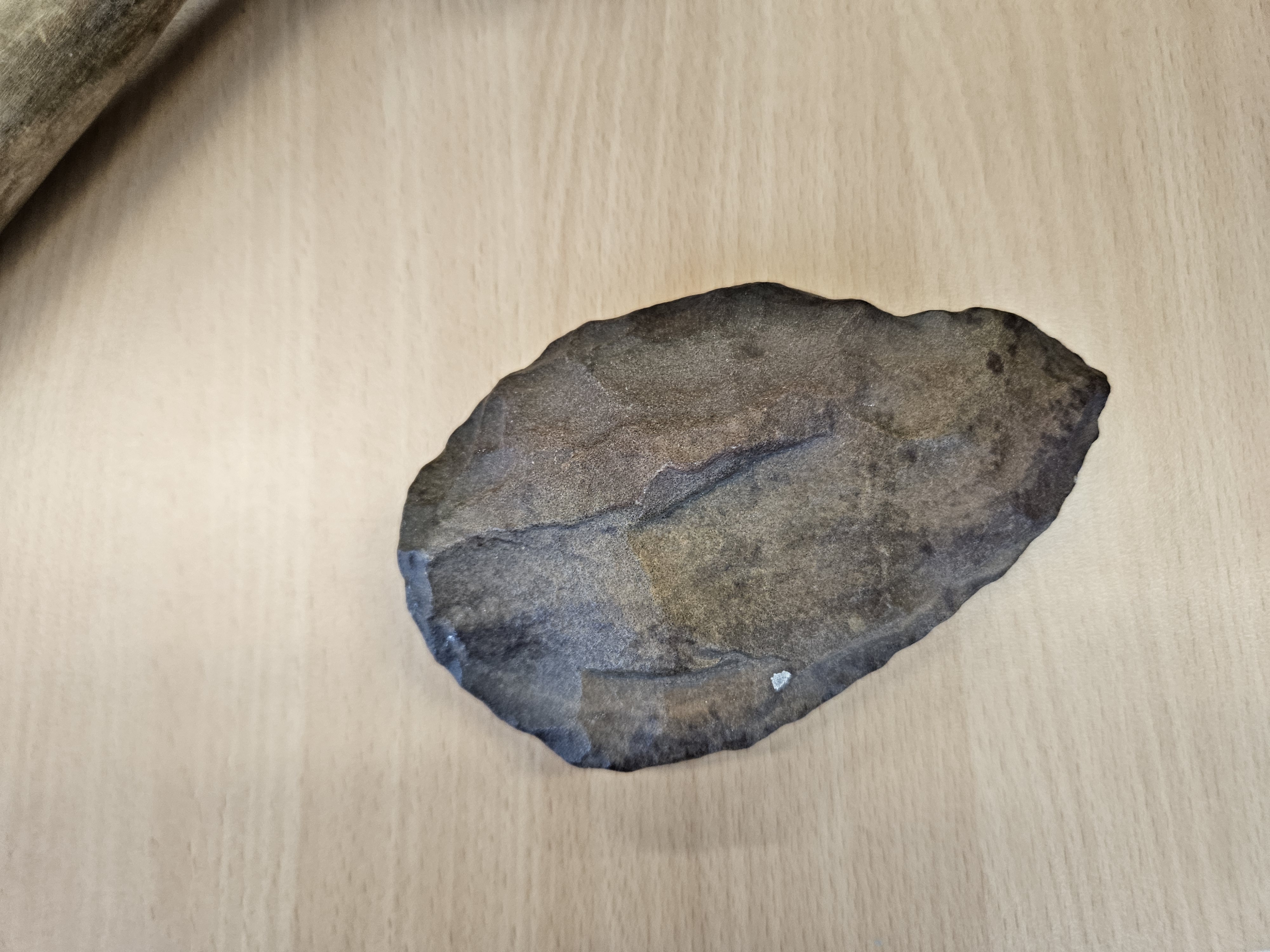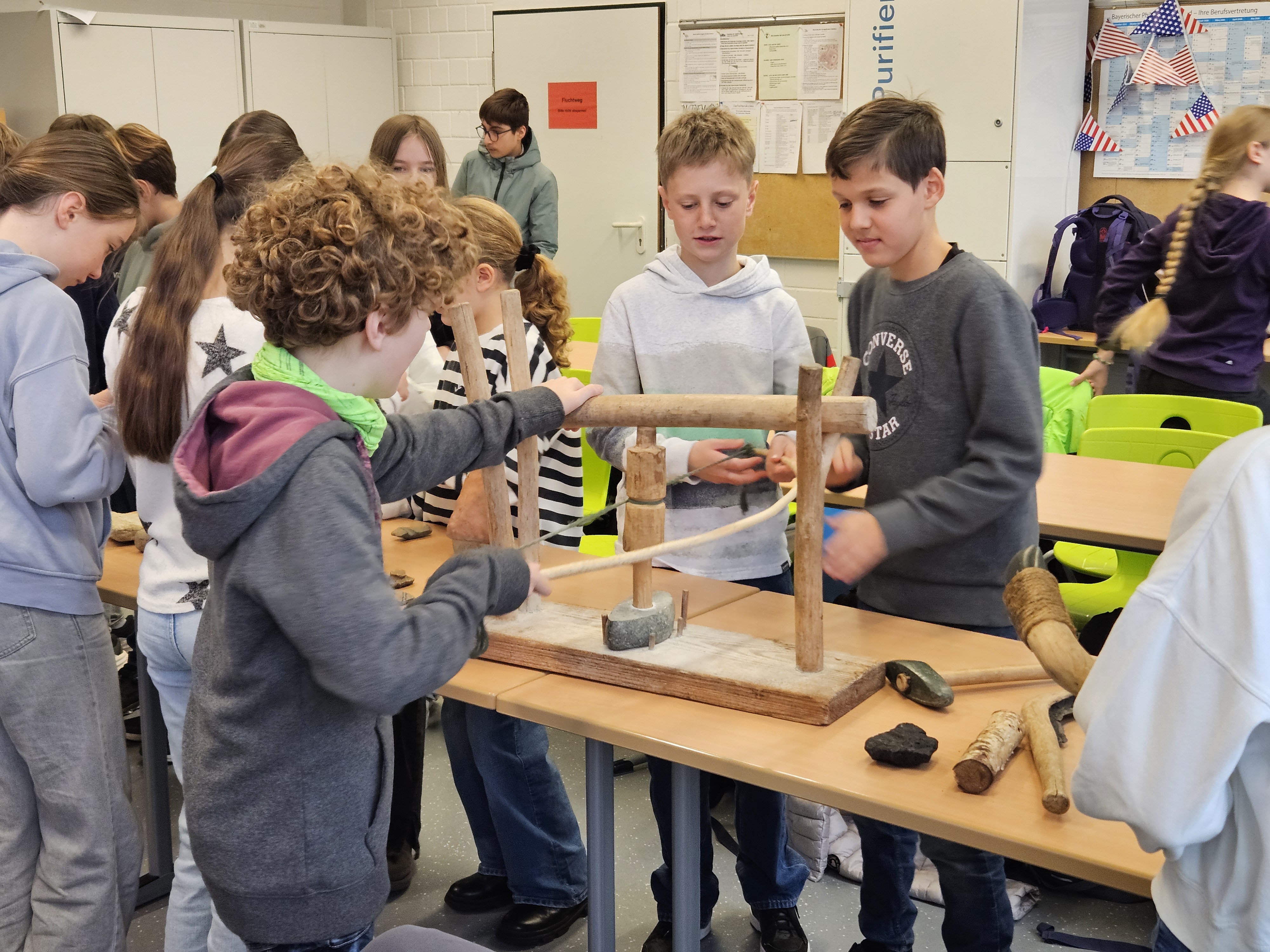 Anschließend erhielten die beiden Gruppen die Möglichkeit, eine Auswahl aus den Funden und Repliken des Referenten zu sehen und dazu Fragen zu stellen. Unter anderem konnten die Schülerinnen und Schüler einen paläolithischen Faustkeil und andere zum Teil Original-Steinwerkzeuge bestaunen. Besonders beeindruckt zeigten sich die Klassen jedoch von den nachgebildeten Arbeitswerkzeugen aus Wurzelholz mit Steinklingen und von dem Steinbohrer, der auch fleißig ausprobiert wurde. Hierbei wurde auch kurz auf die rechtliche Situation hingewiesen, Stichwort Meldepflicht, für den Fall, dass man selbst Artefakte findet.