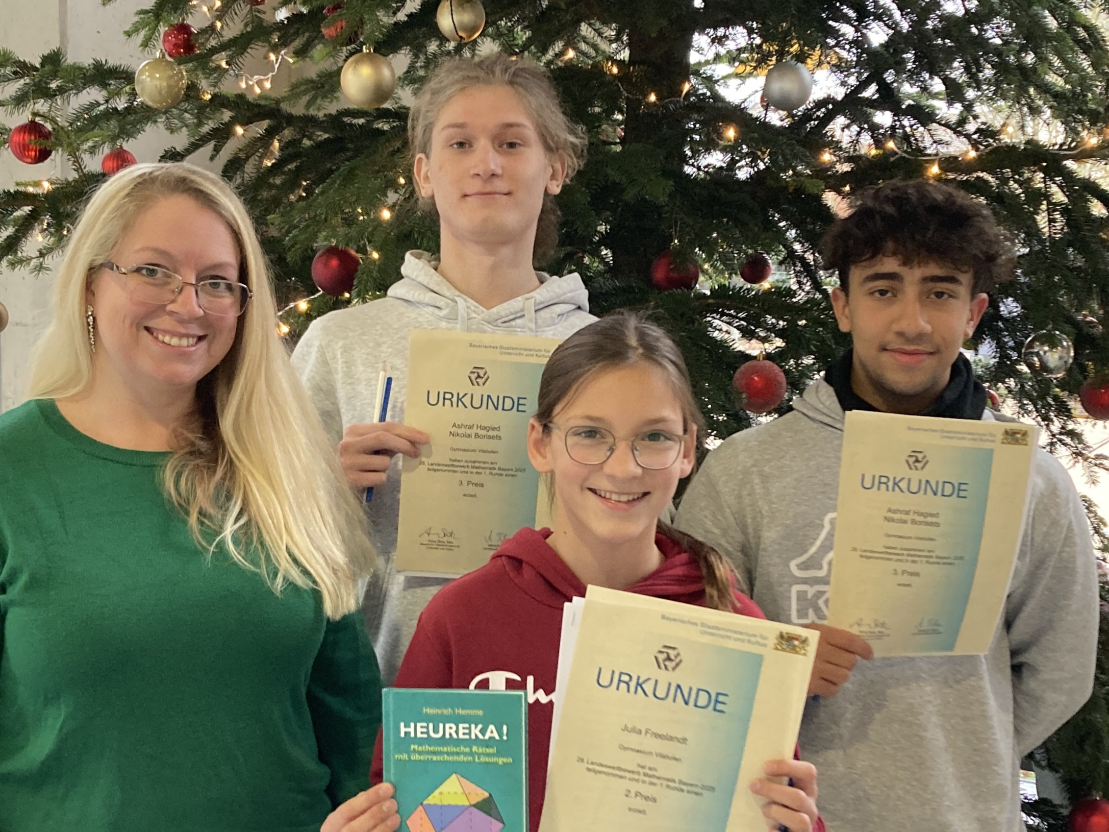 Am Freitag, 12.12.2025 hatten vier unserer Schülerinnen und Schüler Anlass zu großer Freude! In diesem Jahr haben 4 junge mathematische Talente ihr Niveau in einem der anspruchsvollsten Wettbewerbe, die (neben der Mathematik-Olympiade) für Schüler angeboten werden, bewiesen. Über 1000 bayerische Nachwuchsmathematiker nahmen im Herbst an der 1. Runde des LWBM (Landeswettbewerb Mathematik Bayern) teil. Die fordernden Aufgaben verlangen nicht nur mathematisches Können, sondern auch Hartnäckigkeit und Durchhaltevermögen. Größten Respekt an alle Teilnehmer aus der Schulfamilie, die sich dieser Herausforderung gestellt haben! Vier von ihnen haben sich in der 1. Runde überaus erfolgreich geschlagen: Herzliche Gratulation an Nikolai Borisets (10b) und Ashraf Hagied (10b) zu jeweils einem beachtlichen 3. Preis! Und wie schon so oft gratulieren wir darüber hinaus unseren beiden Wettbewerbsmeisterinnen Theresa Hertlein (7d) und Julia Freelandt (8d) zu zwei hervorragenden 2. Preisen. Theresa und Julia haben sich mit ihren Platzierungen eine Einladung zur 2. Runde des LWMB gesichert und stehen nun vor der Herausforderung, bis März vier weitere – noch sehr viel schwierigere - Aufgaben zu knacken! Wir drücken euch die Daumen!