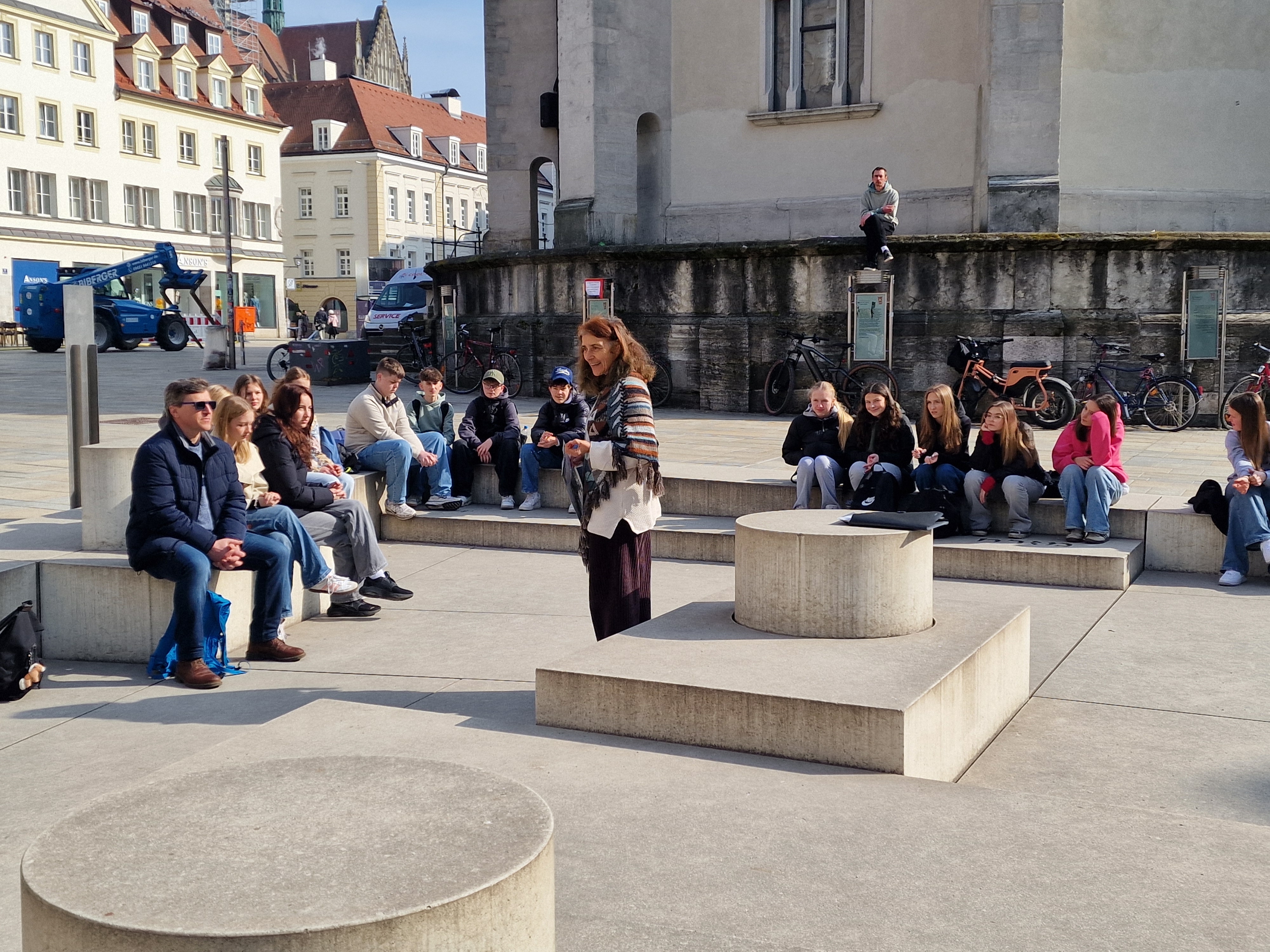 Auf einer Führung konnten die Jugendlichen wichtige Orte und Gegenstände entdecken, die bezeugen, was den Juden im Laufe der Geschichte widerfahren ist: Entweihte Grabsteine, die als Baumaterial missbraucht wurden, einige der über 200 in der Stadt verstreuten Stolpersteine, die das Gedenken an jene Personen bewahren, die zur Zeit des Nationalsozialismus in Konzentrationslager gebracht und getötet wurden, sowie die Grundmauern der alten Synagoge, welche bereits 1519 zerstört wurde. Besonders berührend fanden die Schüler die Geschichte eines 14-jährigen Mädchens, das eines Tages von der Schule nachhause kam und dort niemanden mehr vorfand – ihre Familie war deportiert worden. In einem Brief wurden ihre Verzweiflung und Ratlosigkeit deutlich. Nachdenklich stimmten auch die antisemitischen Werke, die bis heute an der Fassade des Doms angebracht sind: Eine Gruppe Juden, die die Milch eines Schweines trinkt, welches ein Symbol für Unreinheit und den Teufel ist. Eine weitere Darstellung zeigt Personen, die um eine goldene Kuh tanzen, was kritisieren sollte, dass Juden häufig im Geldverleih tätig waren, denn Zinsen zu verlangen war für Christen damals eine Sünde. So hatten Juden auch keine andere Wahl, da sie aus allen anderen Berufsfeldern verdrängt worden waren. Dass diese Werke nicht entfernt wurden, sorgte in Regensburg lange für Diskussionen, jedoch sollen sie nun an die Geschichte der Stadt erinnern und uns eine Warnung für die Zukunft sein.