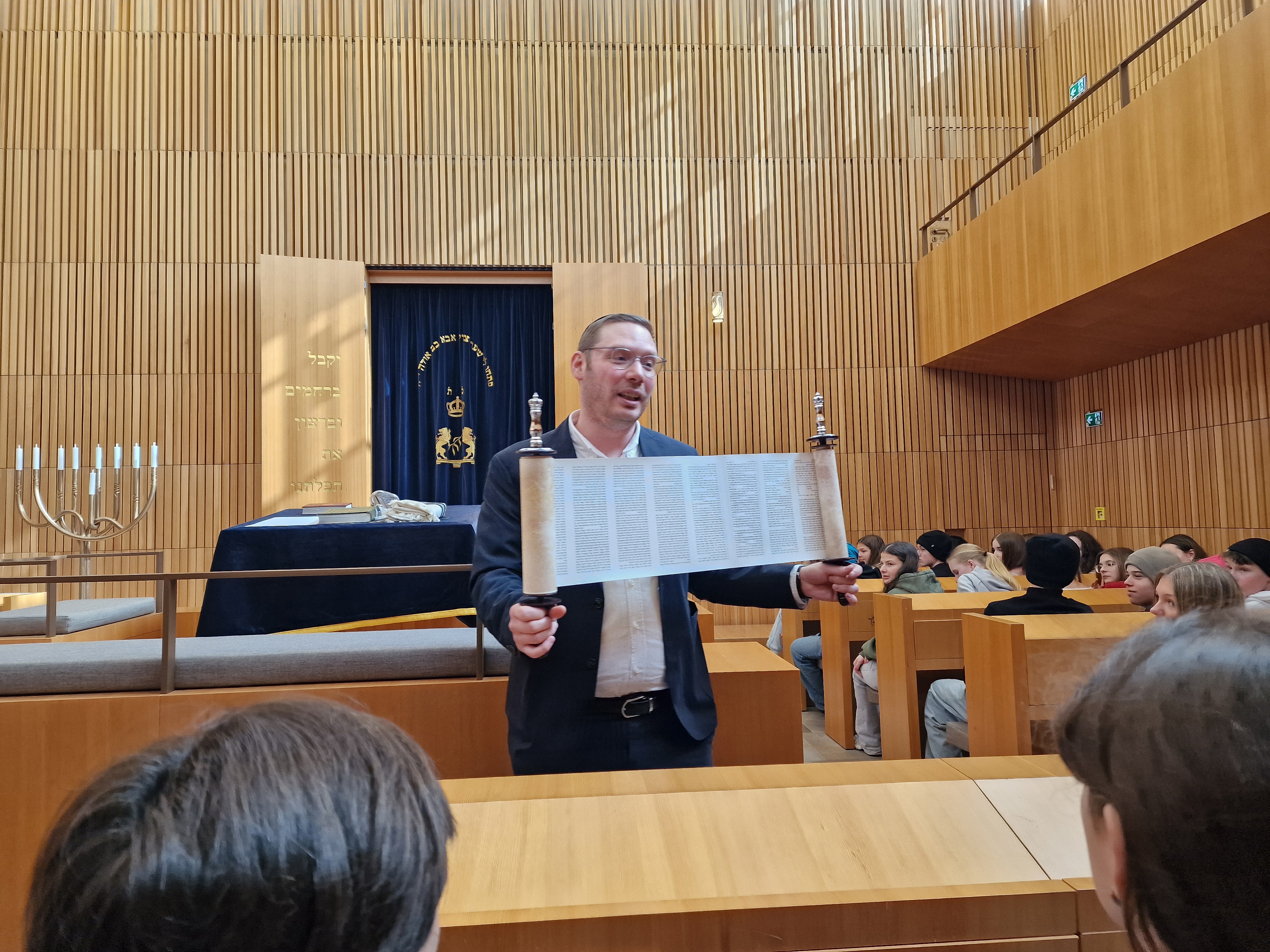 Nach einer Mittagspause durften die Jugendlichen in einer Synagoge Platz nehmen, während ein Rabbiner ihnen die Ausstattung des jüdischen Gotteshauses zeigte, Traditionen erklärte sowie einen Abschnitt aus der Thora vorlas. Anschließend hatten die Schüler und Lehrer die Gelegenheit, alle Fragen zu stellen, die ihnen durch den Kopf gingen. Im Gegensatz zu der vorherigen prunkvolleren Synagoge, die 1938 während der Novemberpogrome zerstört wurde, ist das neue Gotteshaus, welches am selben Ort wieder aufgebaut wurde, eher schlicht und unauffällig. Zudem ist es mit schusssicherem Glas ausgestattet und man kommt nur durch eine Pforte hinein. Dies ist nötig und sogar bayernweit vorgeschrieben, da wieder immer häufiger Anschläge auf Synagogen verübt werden. Es gibt zu denken, dass Juden heutzutage immer noch um ihre Sicherheit besorgt sein müssen und gezwungen sind, wachsam und diskret zu sein.