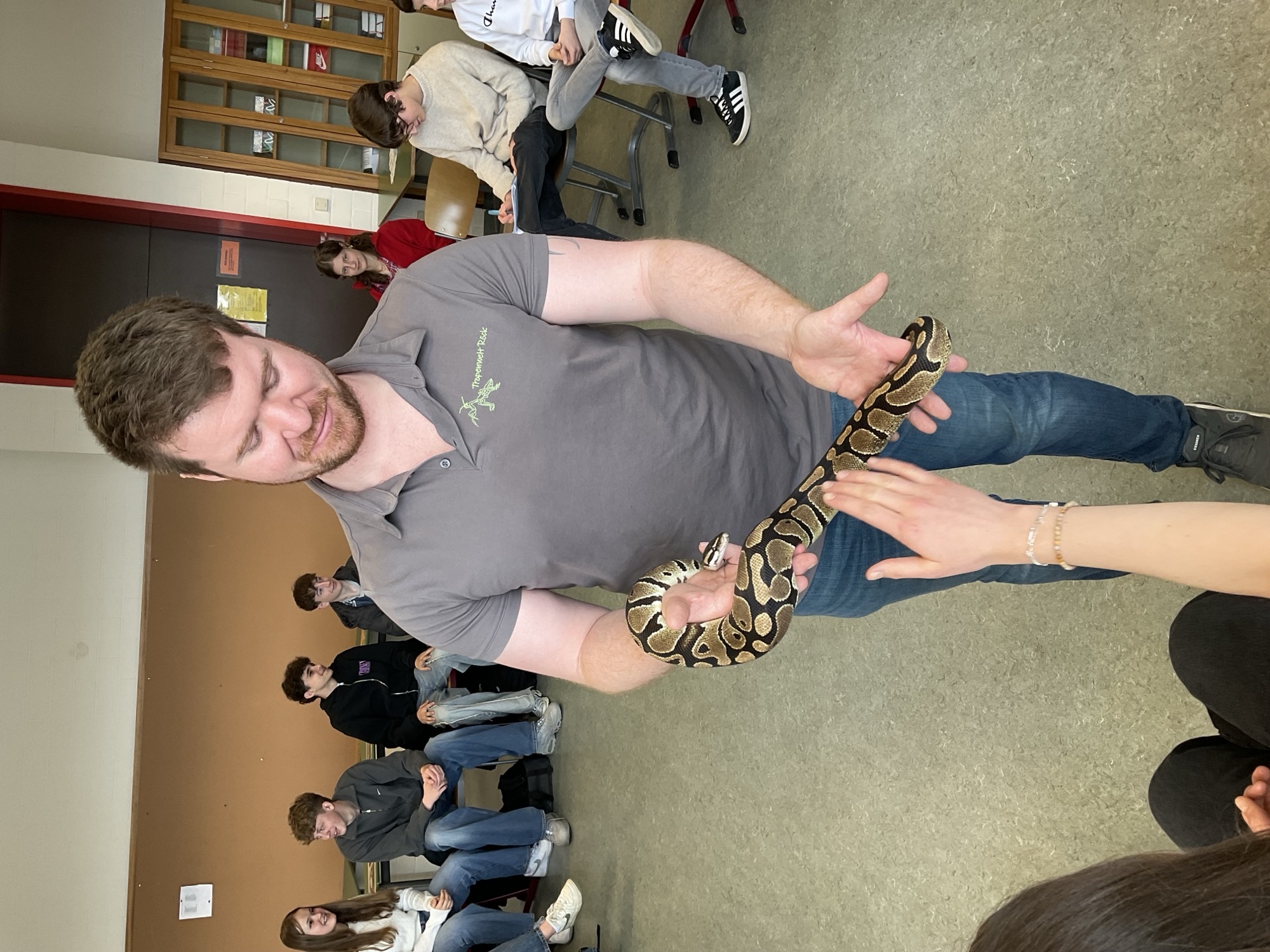 Am 17. und 18. März 2026 besuchte Alexander Röck von “Tropenwelt Röck” aus Eging am See auf Einladung von Birgit Weber das Gymnasium Vilshofen. Er präsentierte den Schülerinnen und Schülern eine Vielzahl an Reptilien und Wirbellosen, darunter einen riesigen Ochsenfrosch, eine Gottesanbeterin und ein Wandelndes Blatt. Er besuchte die 6. und 7. Jahrgangsstufen und jede einzelne Klasse bekam einen separaten Vortrag, welcher jeweils eine Schulstunde dauerte. Die Schülerinnen und Schüler hatten die Möglichkeit, sich näher mit diesen faszinierenden Tieren zu befassen und sie aus nächster Nähe zu beobachten. Darüberhinaus wurde den Teilnehmenden interessante Informationen über die Lebensweisen und Besonderheiten der Tiere vermittelt. Bei einigen Exemplaren bestand zudem die Möglichkeit, diese zu berühren, beispielsweise bei der Haut einer Vogelspinne oder bei einer lebendigen Königspython. Außerdem wurde eine kleine Auswahl von Fossilien präsentiert. Schlussendlich waren die Vorträge sehr informativ, sodass die Schüler und Schülerinnen die Vorträge mit neuen Informationen verlassen konnten.