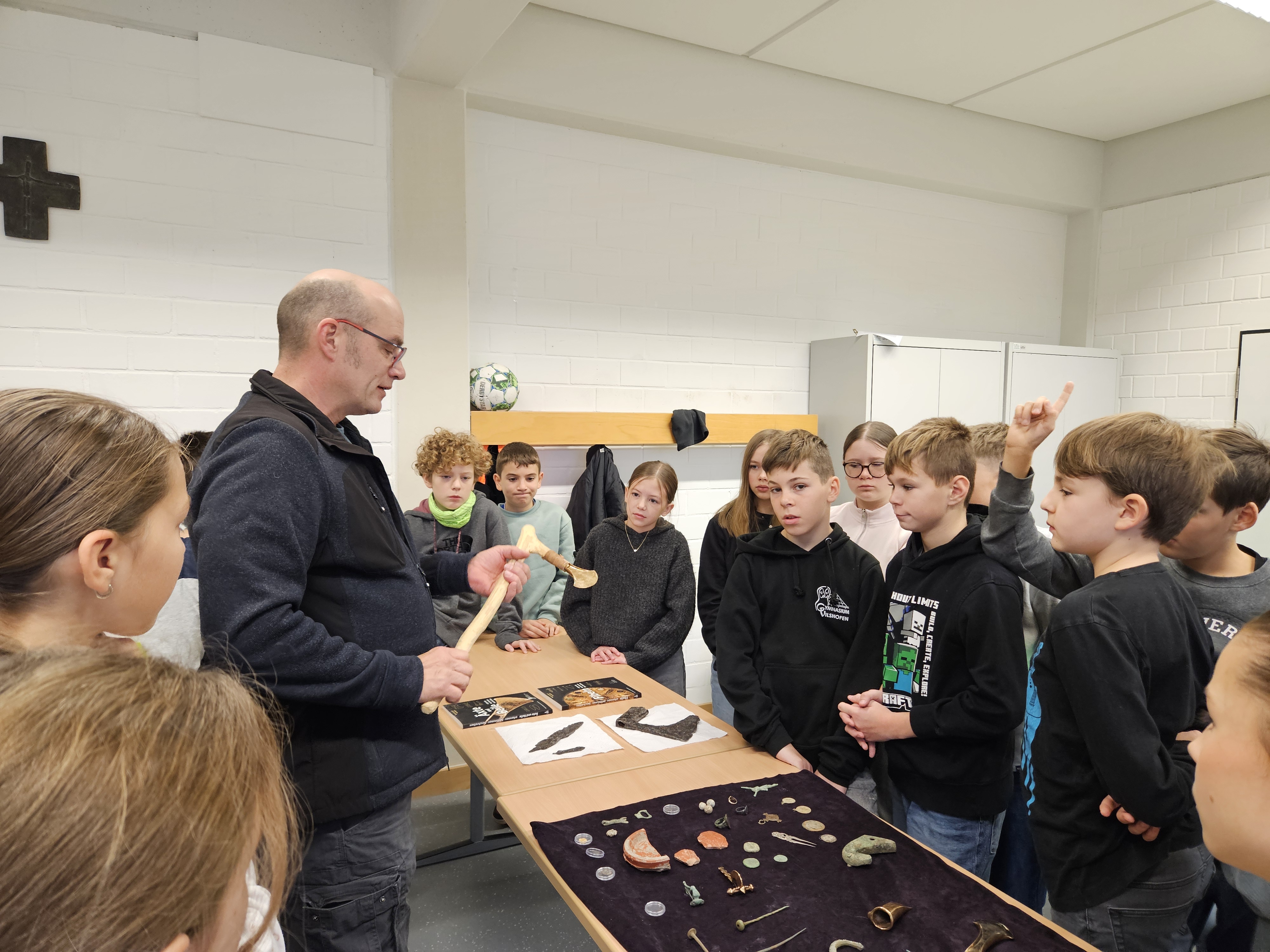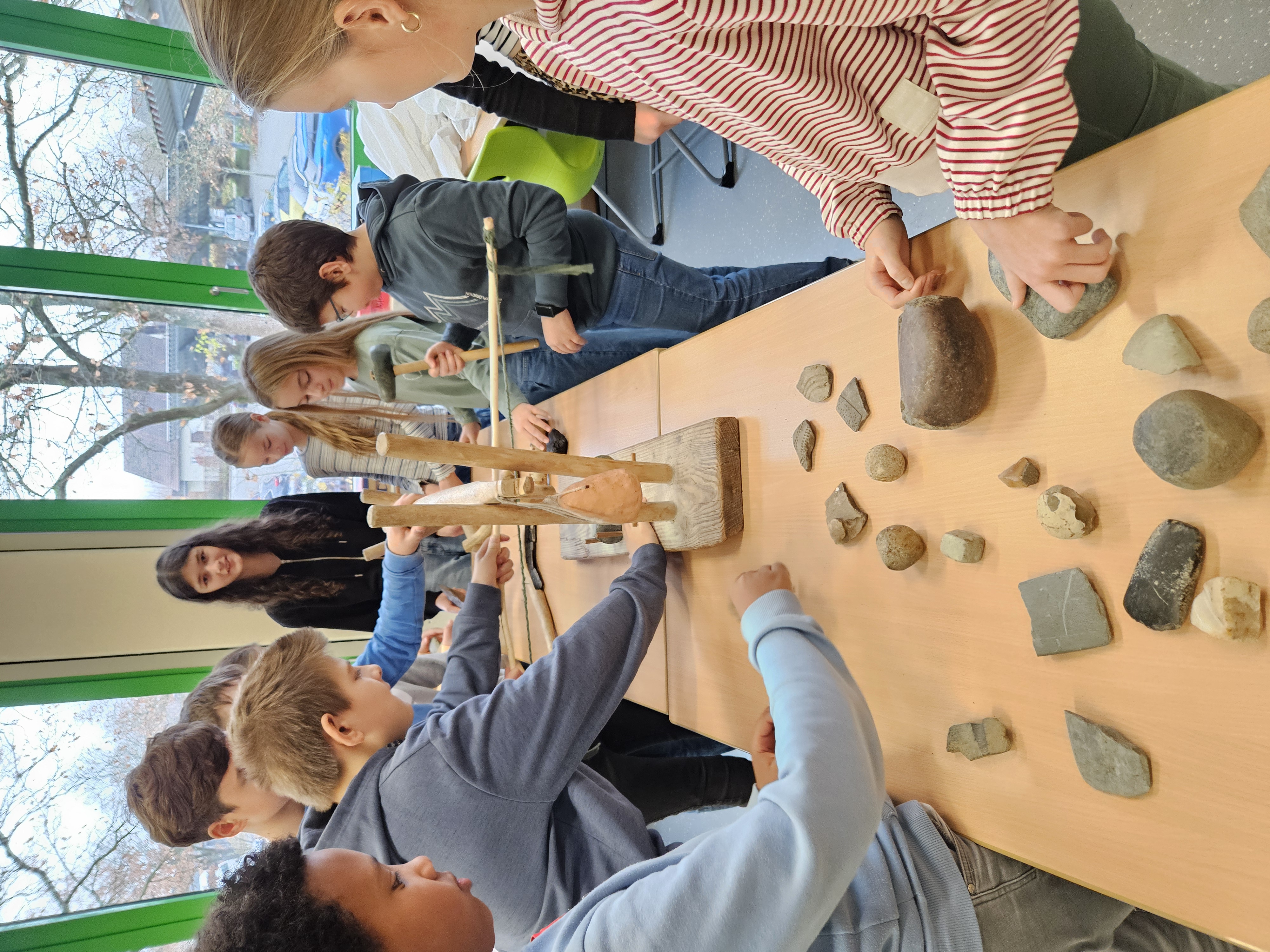 Anschließend erhielten die beiden Gruppen die Möglichkeit, eine Auswahl aus den Funden und Repliken des Referenten zu sehen und dazu Fragen zu stellen. Unter anderem konnten die Schülerinnen und Schüler einen paläolithischen Faustkeil und andere zum Teil Original-Steinwerkzeuge bestaunen. Besonders beeindruckt zeigten sich die Klassen jedoch von den nachgebildeten Arbeitswerkzeugen aus Wurzelholz mit Steinklingen und von dem Steinbohrer, der auch fleißig ausprobiert wurde. Hierbei wurde auch kurz auf die rechtliche Situation hingewiesen, Stichwort Meldepflicht, für den Fall, dass man selbst Artefakte findet.