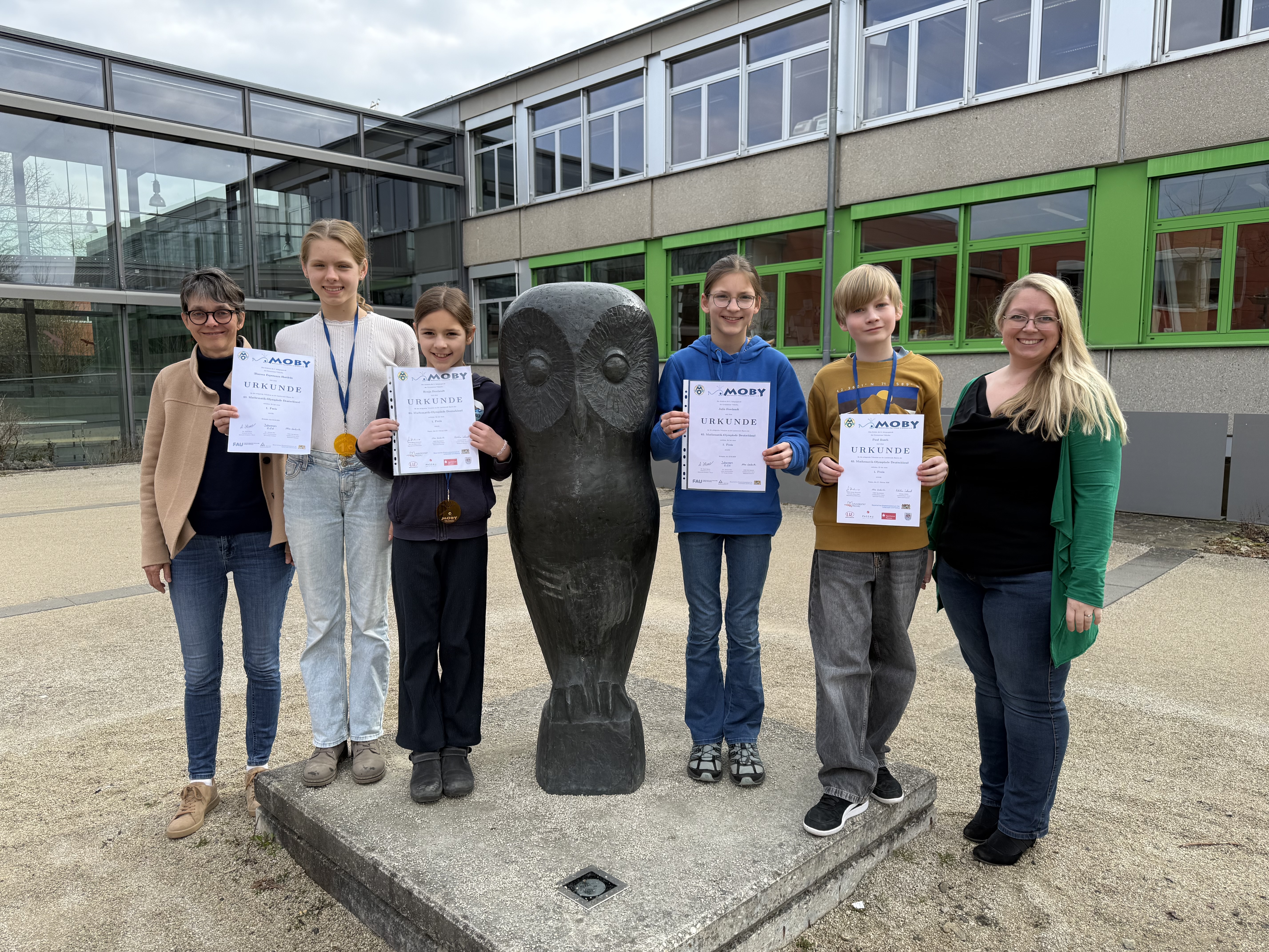 StDin D. Quaß-Klier und StRin S. Streicher gratulieren den Siegerinnen und Siegern der 3. Runde der Mathematik-Olympiade (v.l.): Theresa Hertlein (7d), Ronja Freelandt (5d), Julia Freelandt (8d) und Paul Bosch (6c)