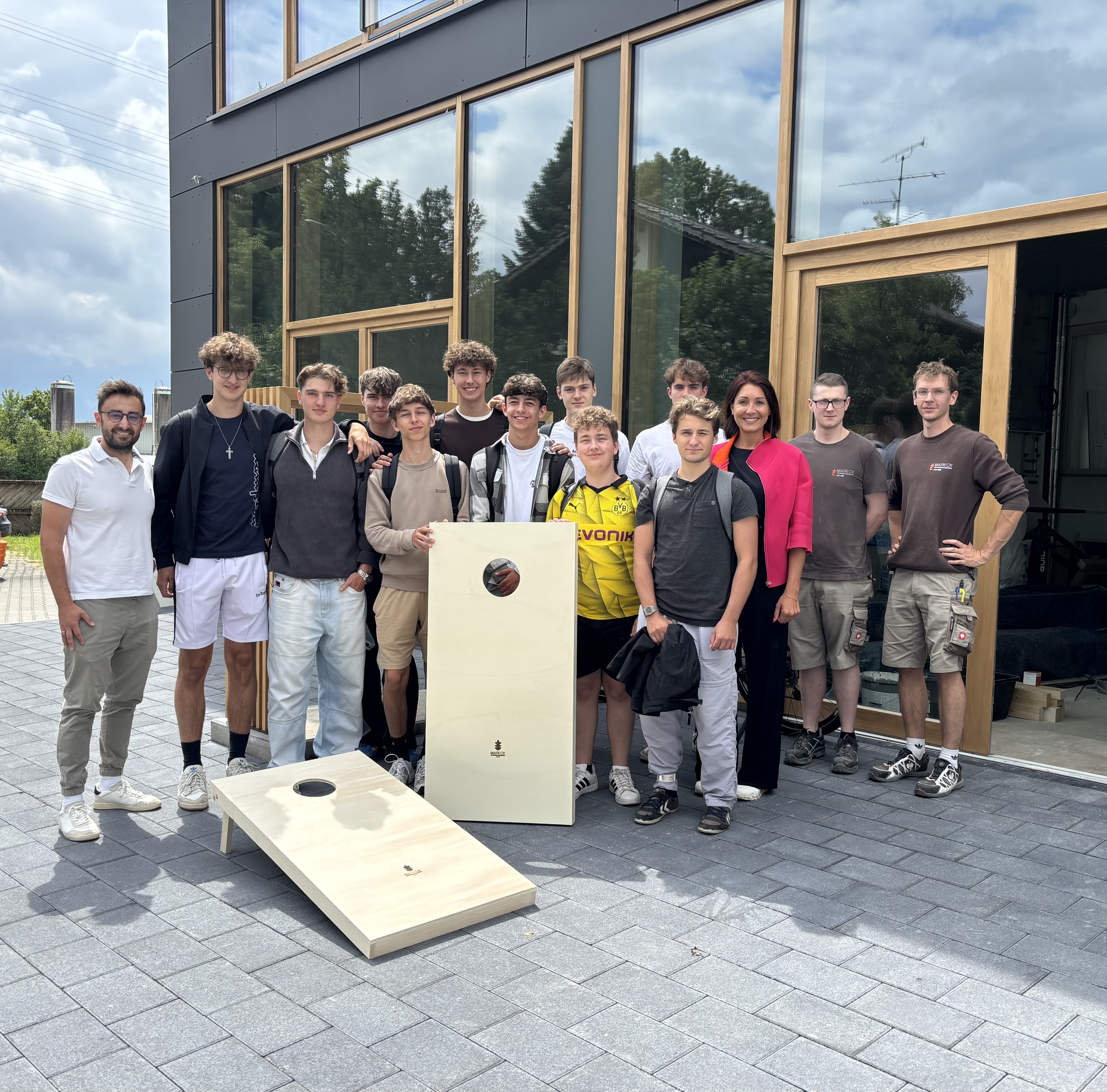 Für die praktische Umsetzung erhielt das Seminar Unterstützung von zwei regionalen Unternehmen. Die Schreinerei Mareck GmbH stellte mit ihrem Know-How zwei stabile und hochwertig verarbeitete Cornhole-Boards zur Verfügung, die eigens für das Projekt gefertigt wurden. Beim abschließenden Besuch in dem Traditionsunternehmen wurden den Schülerinnen und Schülern nach einer Führung durch den Betrieb die Boards offiziell übergeben.